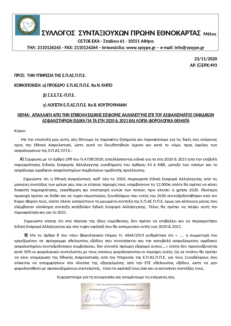 Σε προηγούμενη ανάρτησή μας, σας είχαμε ενημερώσει για την επιστολή μας Εξ: 493/23.11.2020 που αποστείλαμε προς την Ε.Π.ΑΣ.Π.Π.Ε., με θέμα την απαλλαγή των παροχών, που υπερβαίνουν ετησίως τα 12.000€, από την Ειδική Εισφορά Αλληλεγγύης για τα έτη 2020-2021, βάσει του Ν.4738/2020.