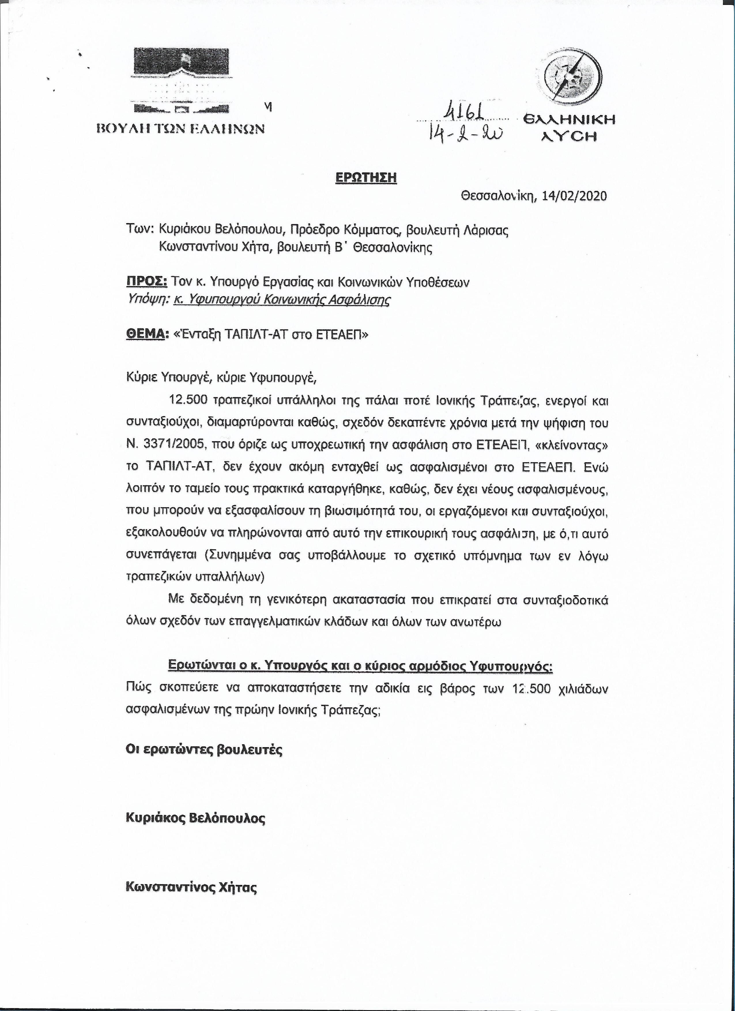 Ο κ. Χήτας φάνηκε εξ αρχής δεκτικός στο αίτημά μας και μάλιστα υπέβαλε από κοινού με τον Πρόεδρο του κόμματος, κ. Κυριάκο Βελόπουλο, την κάτωθι ερώτηση στη Βουλή προς τον Υπουργό Εργασίας και Κοινωνικών Υποθέσεων και τον Υφυπουργό Κοινωνικής Ασφάλισης σχετικά με την ένταξη του ΤΑΠΙΛΤ-ΑΤ στο ΕΤΕΑΕΠ.