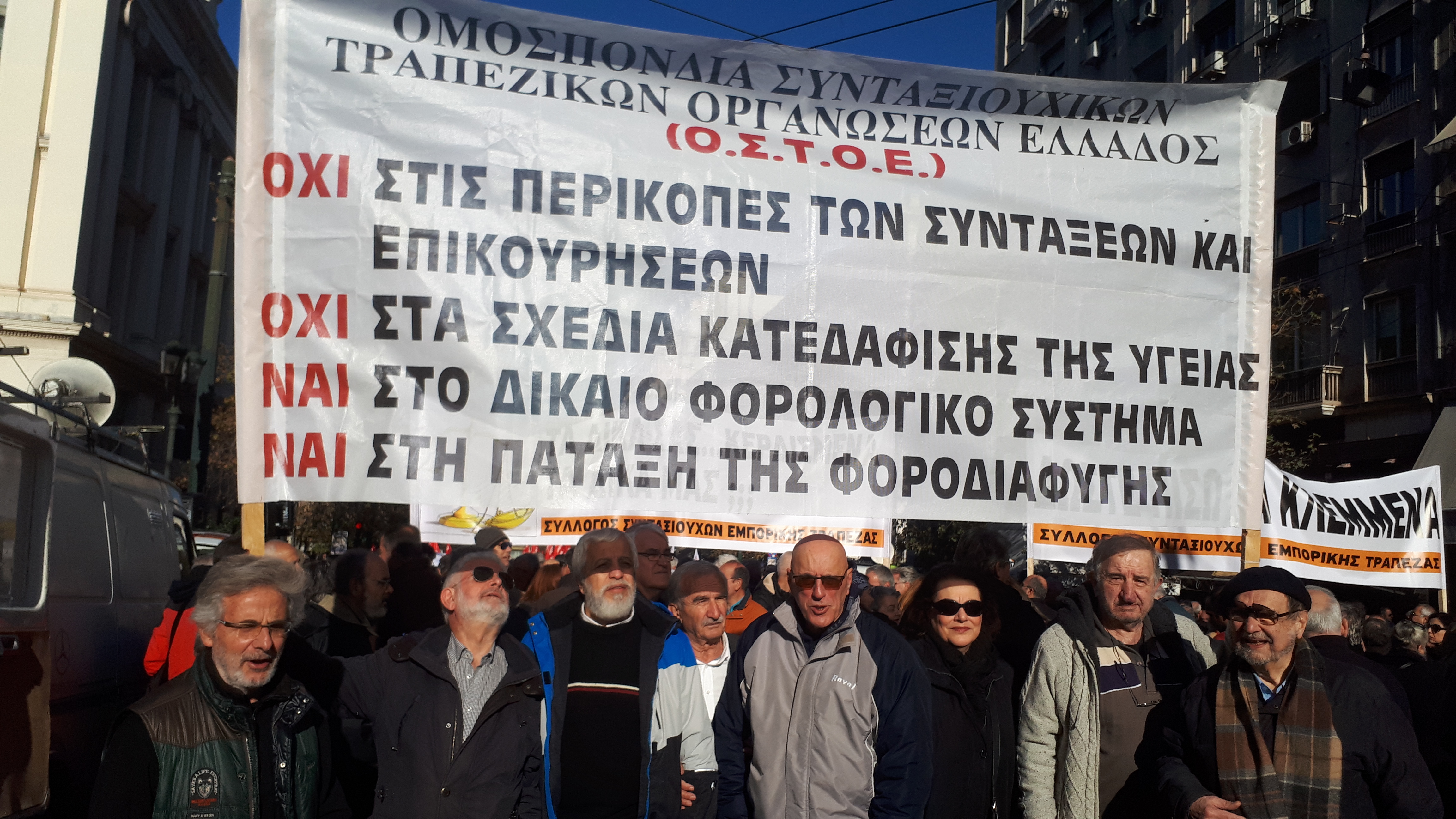 Την ίδια ώρα, στην είσοδο του Συμβουλίου της Επικρατείας διαδήλωσαν οι Συνταξιουχικές Οργανώσεις και στη συνέχεια πραγματοποίησαν πορεία, διεκδικώντας ένα καλύτερο αύριο, με την αποκατάσταση της τεράστιας αδικίας που επέφεραν τα μνημόνια και ζητώντας την καταβολή των αναδρομικών τους από την περικοπή των συντάξεων τους, αλλά και την κατάργηση του 13ου και 14ου μισθού (δώρα Χριστουγέννων, Πάσχα, επιδόματος αδείας).
