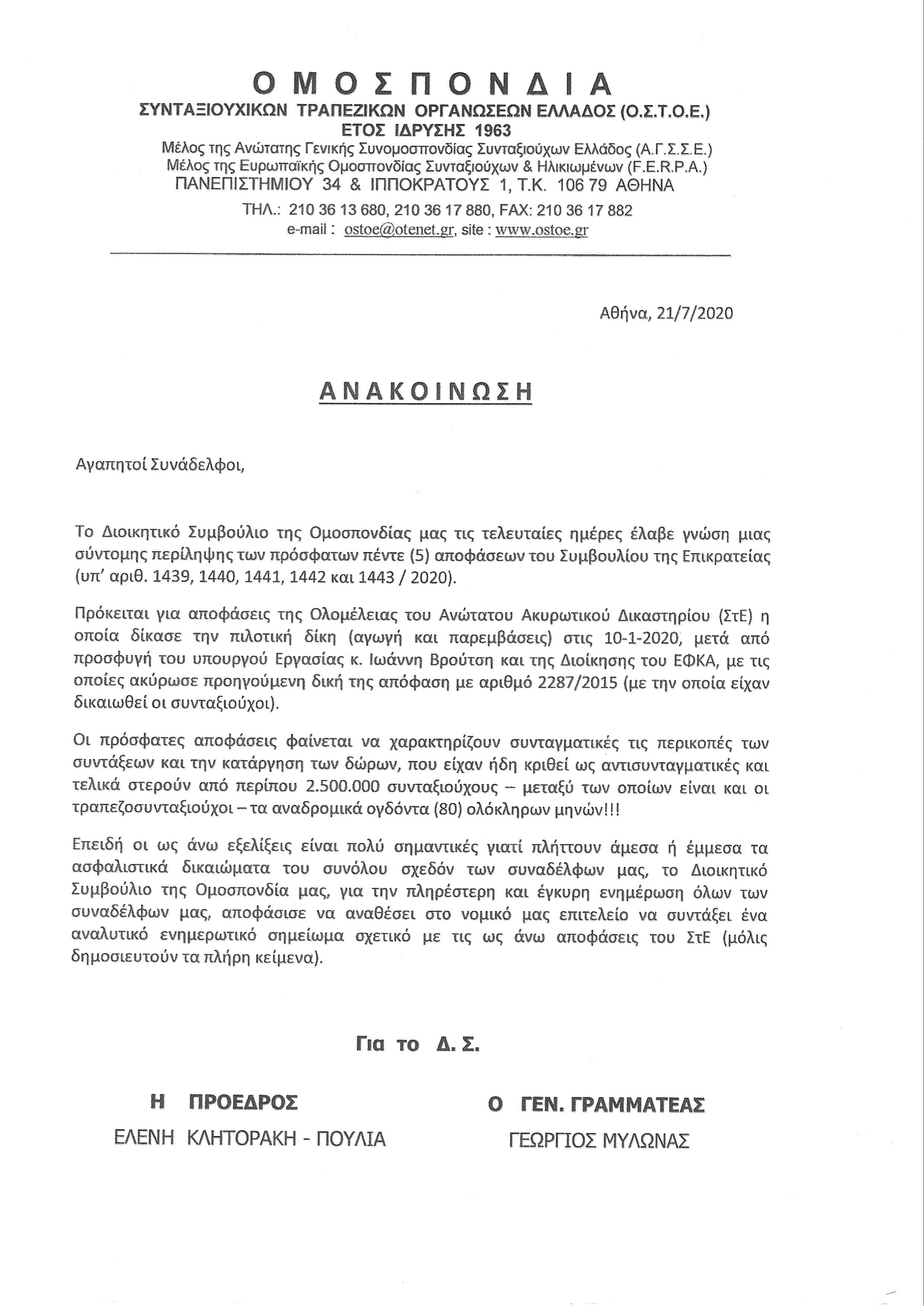 ΟΣΤΟΕ: Ανακοίνωση της Ομοσπονδίας μας σχετικά με την απόφαση του ΣτΕ για τα αναδρομικά των συντάξεων απο τις μνημονιακές μειώσεις του 2012.