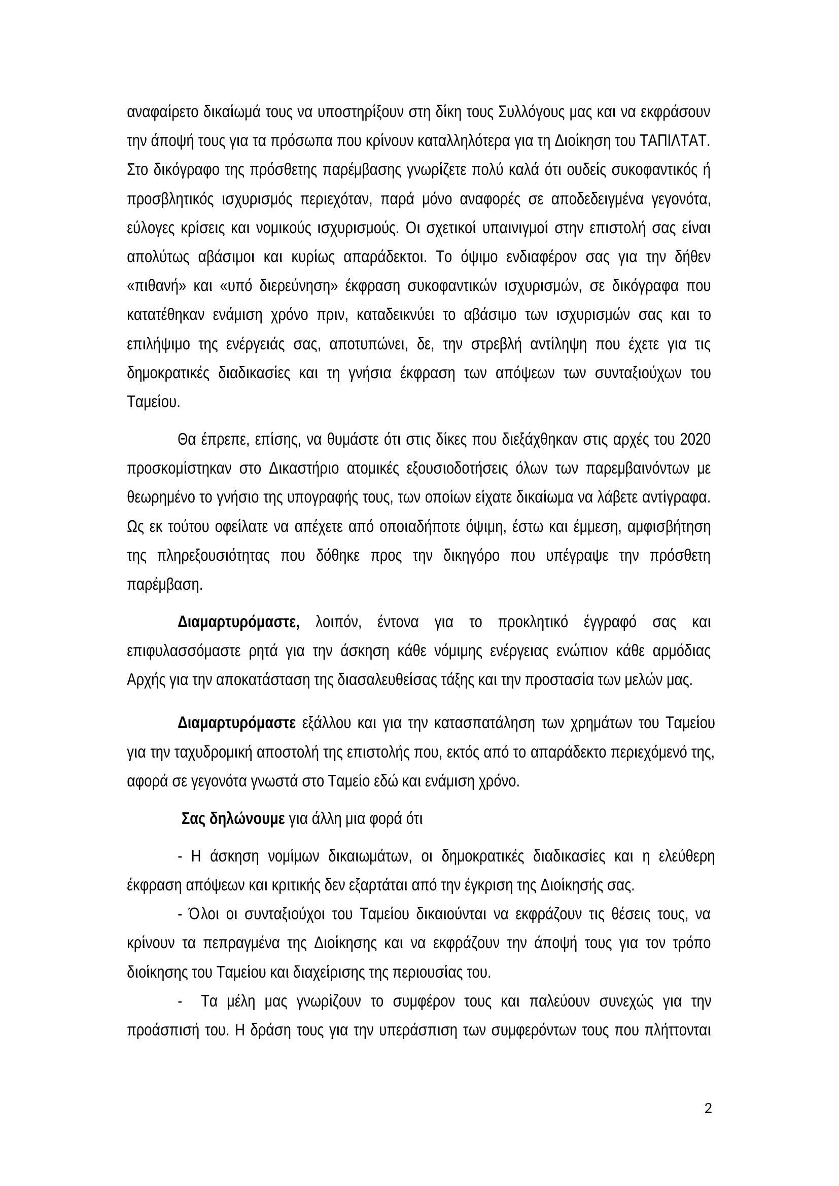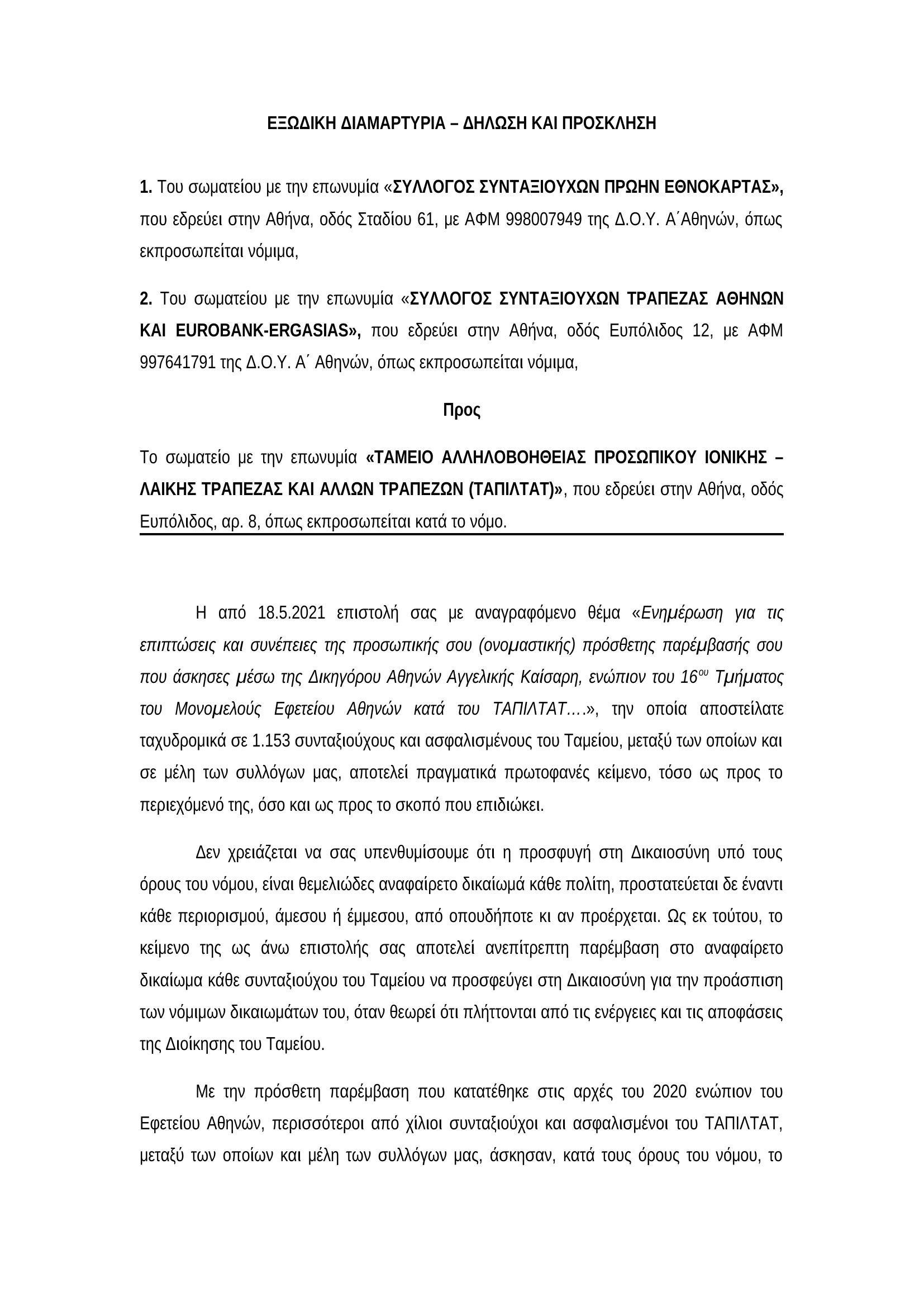 Συνάδελφοι, σε συνέχεια της Νο 12/25.05.2021 ανακοίνωσής μας, σας κάνουμε γνωστό το εξώδικο που κοινοποιήσαμε στο ΤΑΠΙΛΤ-ΑΤ, ως μία επιπλέον απάντηση στην απειλητική τους επιστολή με ημερομηνία 18.05.2021, την οποία απέστειλαν σε συνταξιούχους και ασφαλισμένους του Ταμείου. Το εξώδικο αυτό είναι από τον Σύλλογό μας και το Σύλλογο Συνταξιούχων Τράπεζας Αθηνών – Eurobank, ενώ άλλοι Σύλλογοι, έχουν ήδη αποστείλει κι εκείνοι ανάλογο εξώδικο.