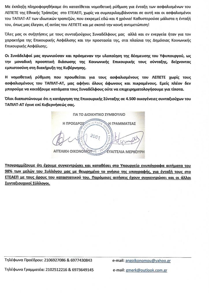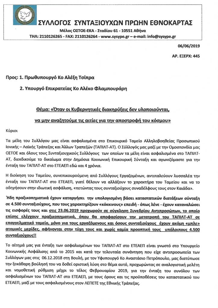 Συνάδελφοι, ο Σύλλογός μας, στις 06.06.2019, εκτός από την κοινή Ανοιχτή Επιστολή που απέστειλε με την Ομοσπονδία μας ΟΣΤΟΕ και τους άλλους Συνταξιουχικούς Συλλόγους για το θέμα της ένταξης των ασφαλισμένων του ΤΑΠΙΛΤ-ΑΤ στο ΕΤΕΑΕΠ, μαζί με τους ασφαλισμένους του ΛΕΠΕΤΕ, απέστειλε επίσης την παρακάτω επιστολή στον Πρωθυπουργό και τον Υπουργό Επικρατείας. Ωστόσο είναι πλέον γεγονός ότι παρά τις προσπάθειές μας, στις 07.06.2019 κατατέθηκε και ψηφίστηκε τροπολογία μόνο για τους ασφαλισμένους του ΛΕΠΕΤΕ.