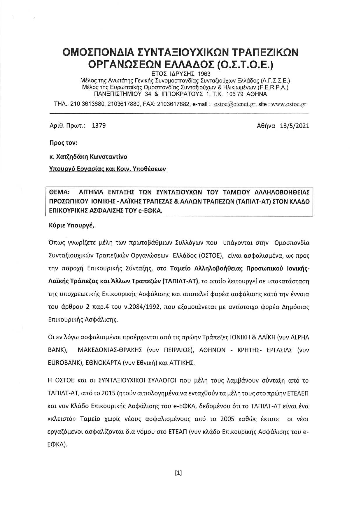 ΤΑΠΙΛΤ-ΑΤ: Επιστολή ΟΣΤΟΕ & Συνταξιουχικών Συλλόγων προς τον Υπουργό Εργασίας Κο Χατζηδάκη Posted on 14 Μαΐου 202117 Ιουνίου 2021 by Οικονόμου Αγγελική