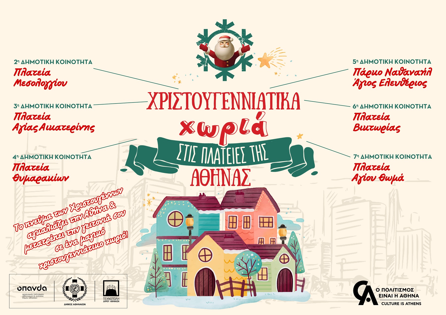 Ο Άγιος Βασίλης και τα Ξωτικά του θα βρίσκονται καθημερινά στις θέσεις τους, από 17 Δεκεμβρίου 2021 έως 7 Ιανουαρίου 2022, στις Πλατείες Μεσολογγίου στο Παγκράτι, Αγίας Αικατερίνης στα Κάτω Πετράλωνα, Αθανασίου Διάκου στα Θυμαράκια στα Κάτω Πατήσια, Βικτωρίας στην Κυψέλη, Αγίου Θωμά στο Γουδή και στο Πάρκο Ναθαναήλ Αγίου Ελευθερίου, για να χαρίσουν στους μικρούς μας φίλους όμορφες στιγμές με χριστουγεννιάτικες κατασκευές, γλυκό-κεράσματα, Christmas hand painting και πολλές ακόμη δράσεις για όλη την οικογένεια.