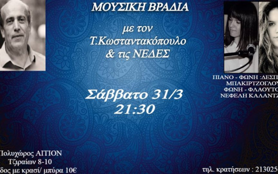 Μουσική Βραδιά με Έντεχνο Ελαφρολαϊκό και Ξένο Ρεπερτόριο στο Cafe- Πολυχώρο «Αίτιον», Τζιραίων 8-10, Μακρυγιάννη (Σταθμός Μετρό: Ακρόπολη). Τηλ. κρατήσεων : 2130256666 Αγ...Read More