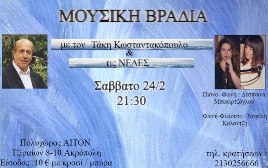 Μουσική Βραδιά με Έντεχνο Ελαφρολαϊκό Και Ξένο Ρεπερτόριο στο Cafe- Πολυχώρο «Αίτιον», Τζιραίων 8-10, Μακρυγιάννη (Σταθμός Μετρό: Ακρόπολη). Τηλ. κρατήσεων : 2130256666 Αγαπητές ...Read More
