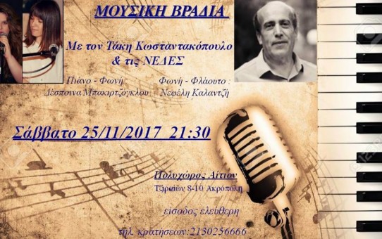 Μουσική Βραδιά με Έντεχνο Ελαφρολαϊκό Και Ξένο Ρεπερτόριο στο Cafe- Πολυχώρο «Αίτιον», Τζιραίων 8-10, Μακρυγιάννη (Σταθμός Μετρό: Ακρόπολη). Τηλ. κρατήσεων : 2130256666 Αγαπητές και Αγαπητοί Συνάδελ...Read More